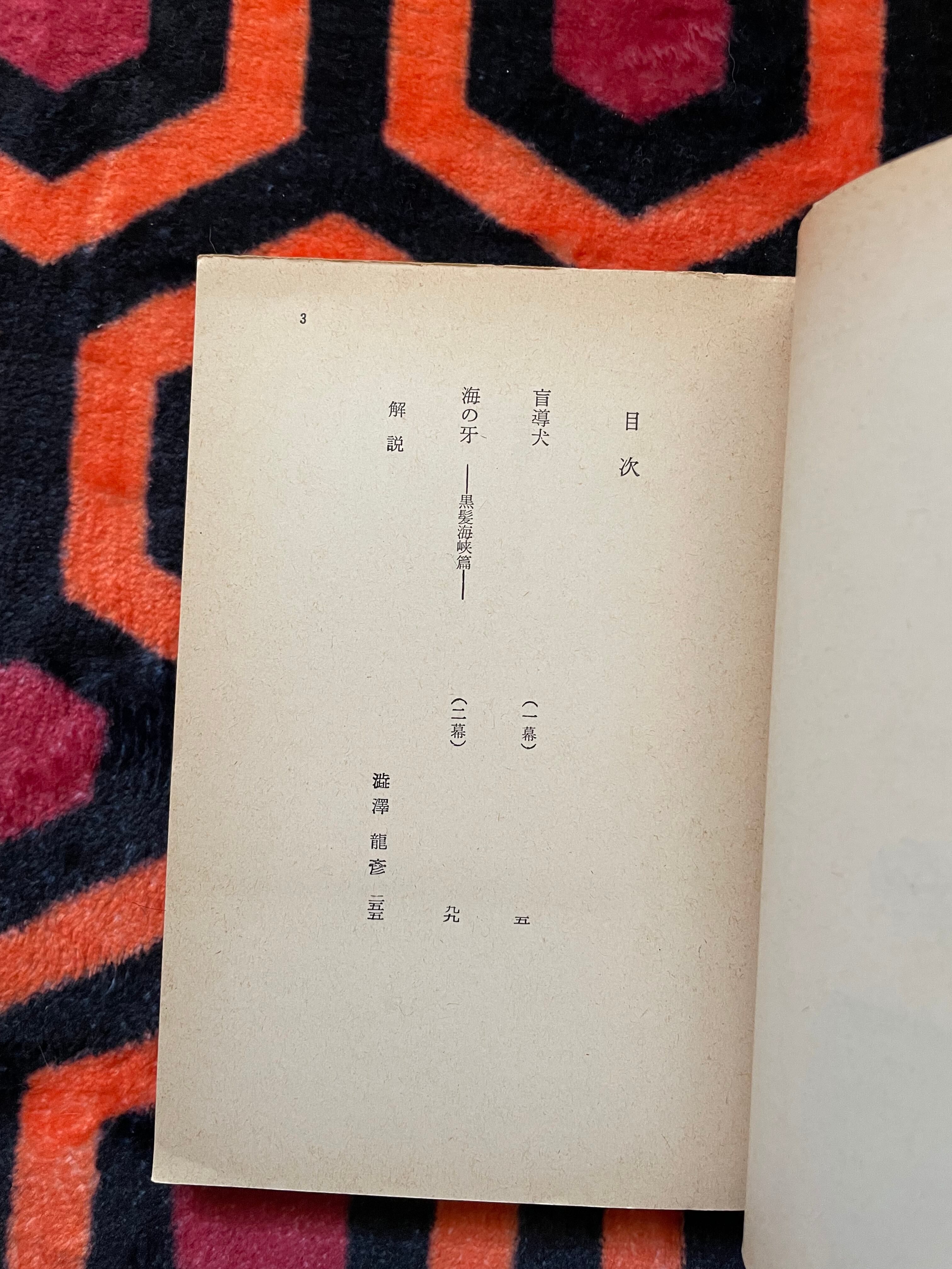 澁澤龍彦氏の小説「犬狼都市」の後日譚として、唐十郎氏が戯曲化した「盲導犬」と二幕もの「海の牙」未刊の2篇を収録した本書。