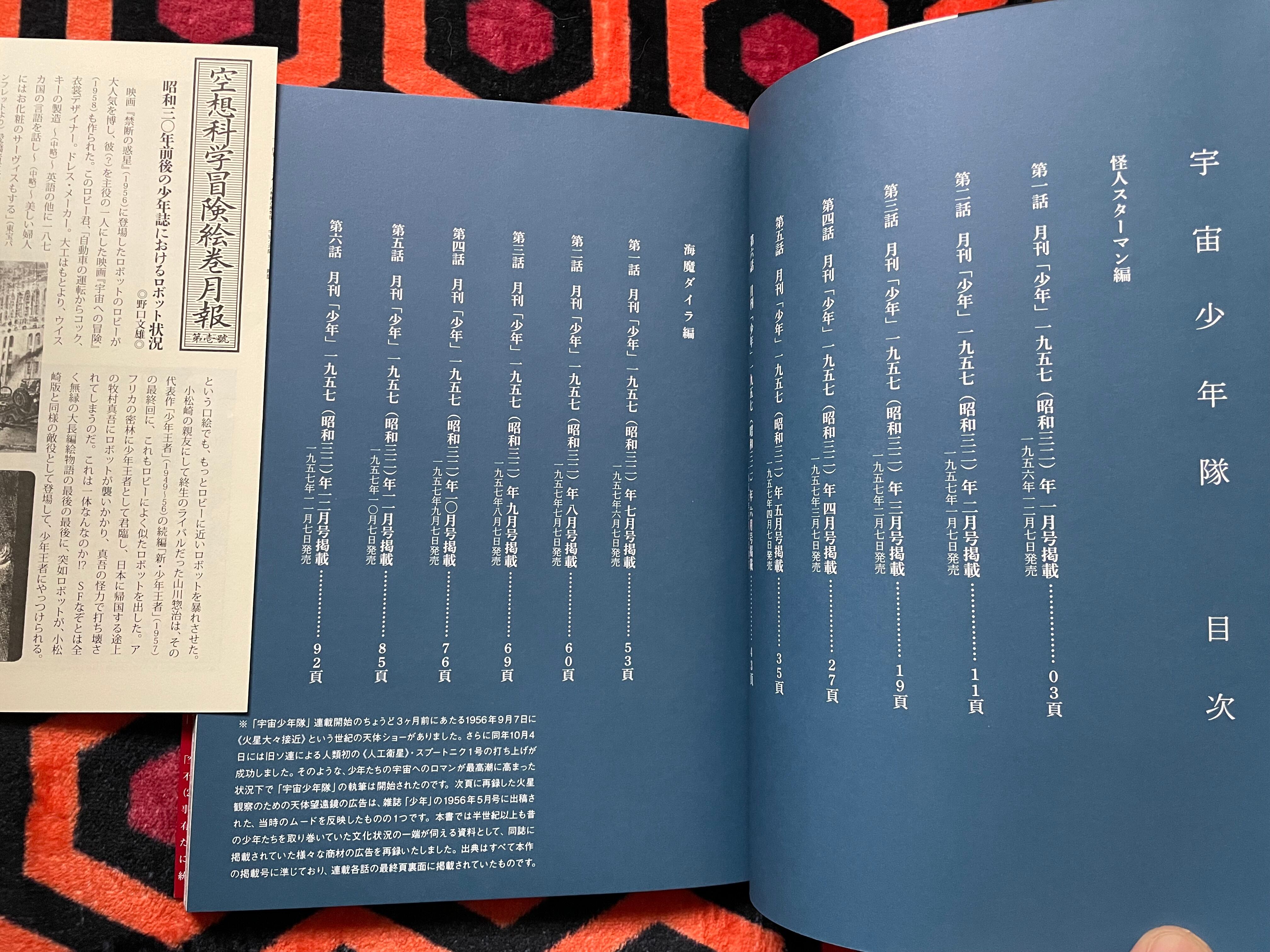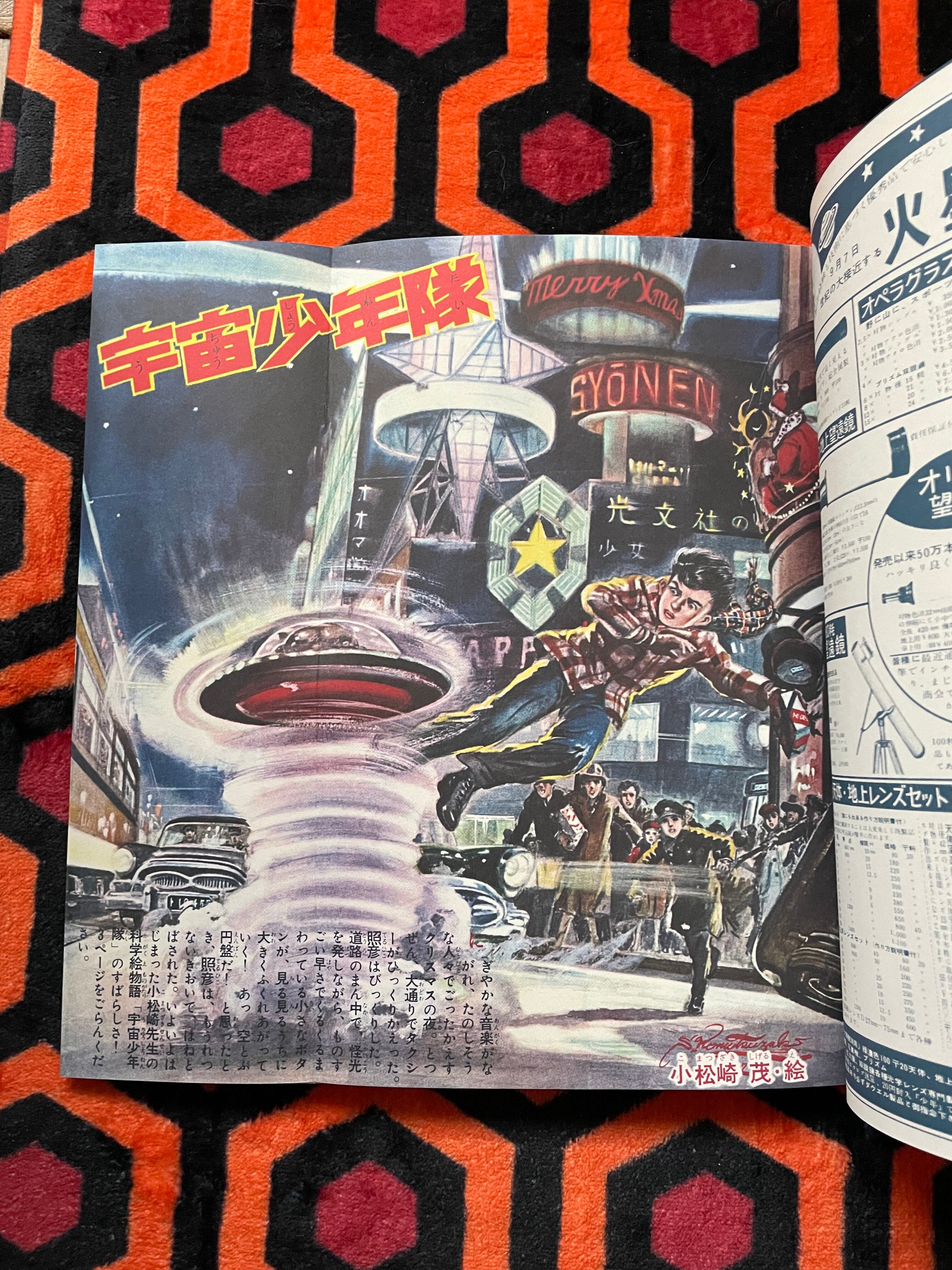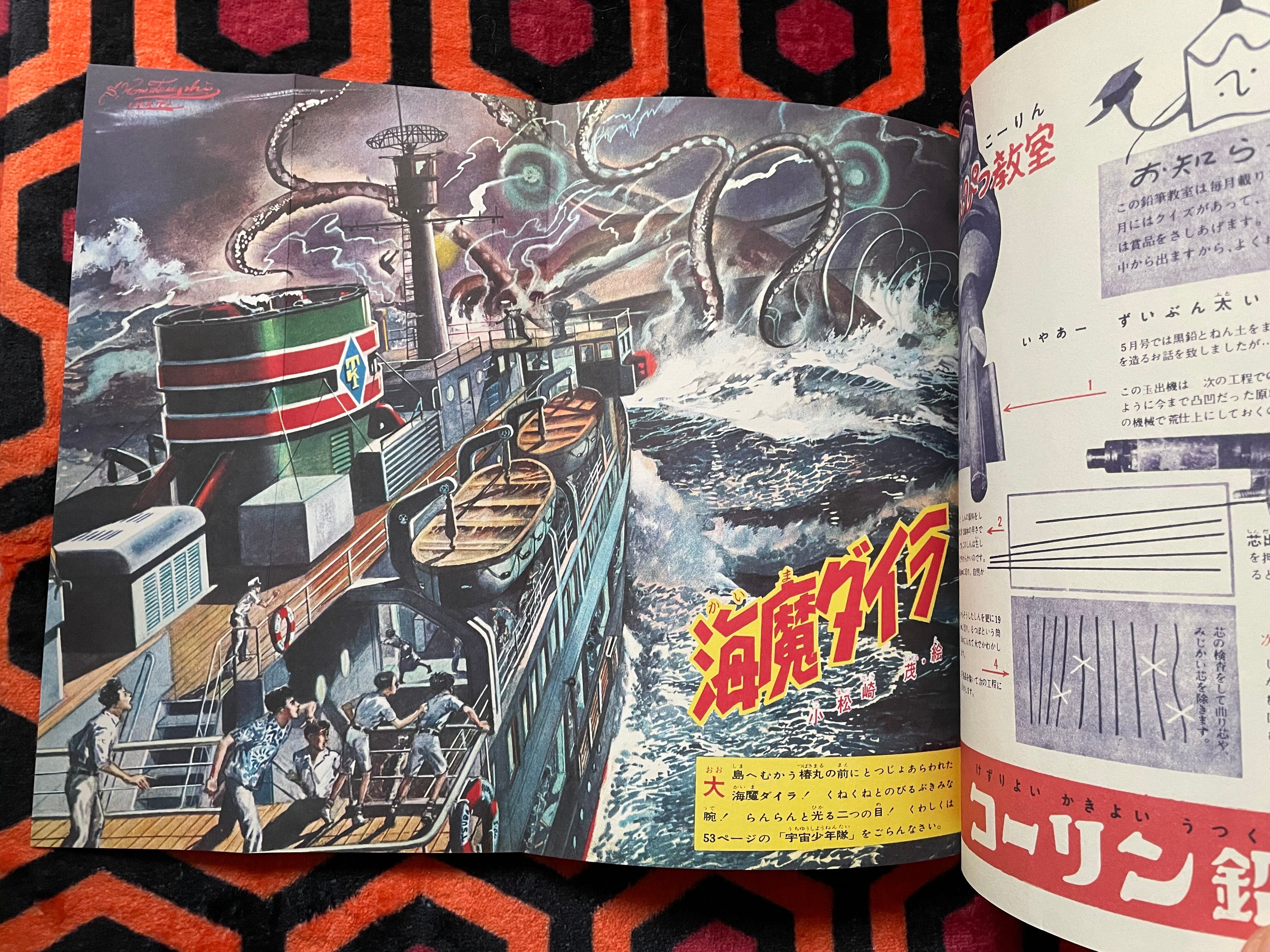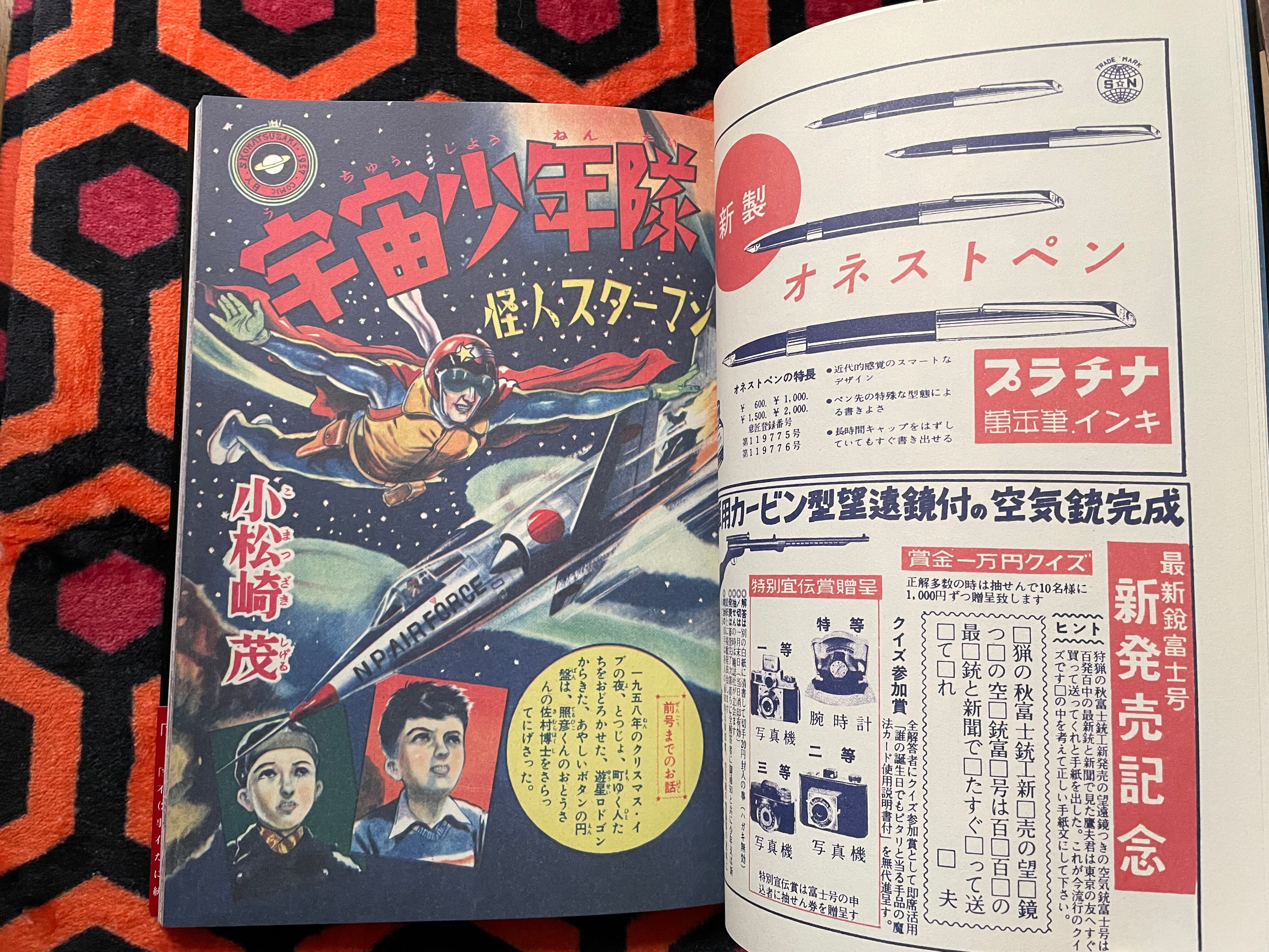 1957(昭和32)年に月刊「少年」に掲載された、小松崎茂氏の「宇宙少年隊」怪人スターマン編と海魔ダイラ編を完全再現し、復刻した本書。初の本格アメコミ様式で、単行本化されなかった作品。