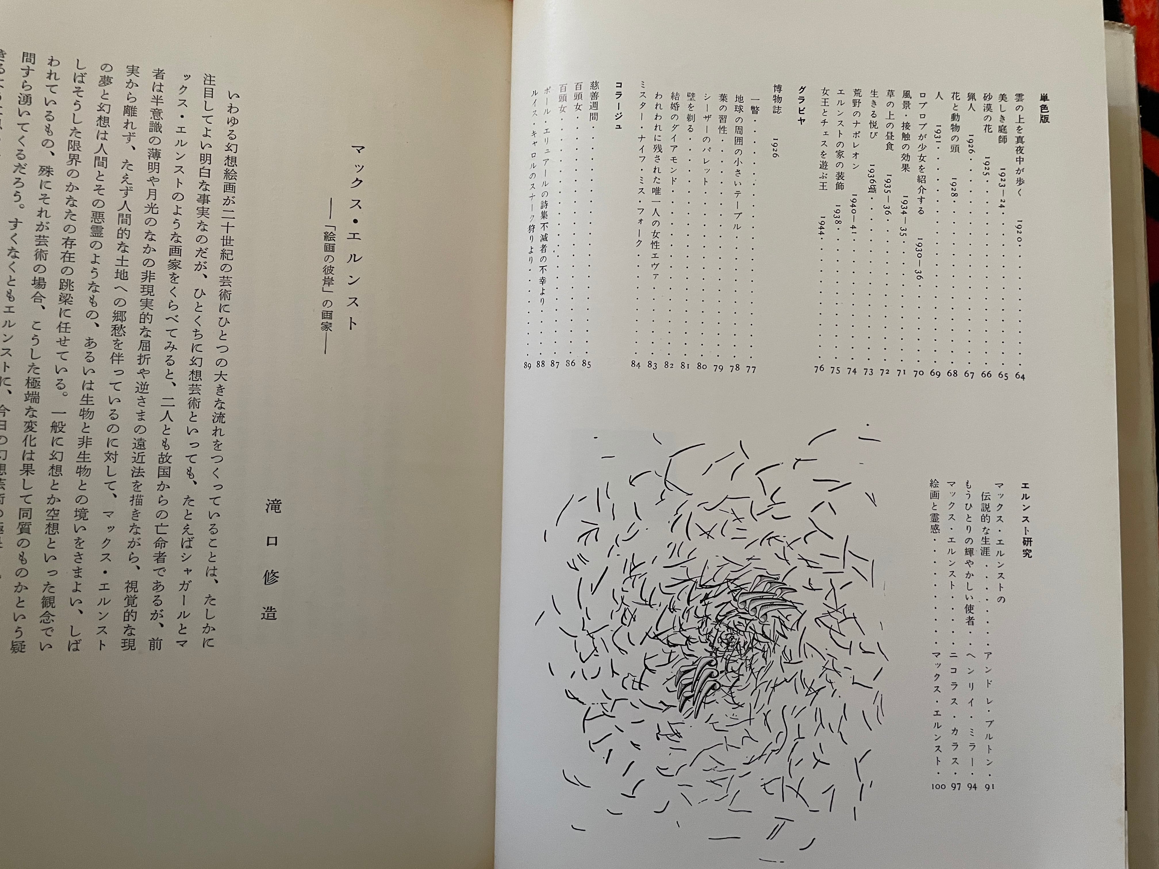シュルレアリスム運動の代表的な幻想画家・コラージュ作家マックス・エルンストの作品と瀧口修造氏の解説・ブルトンなどによる作家論などを収録した画集の本書。